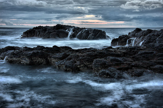 Waves were intermittently crashing over the rocks causing “mini waterfalls” to appear.