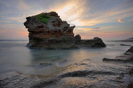 Initially we went there in the middle of the day to try out some “black glass” ND400 filters. The idea was to shoot some daytime long exposures of the low tide water interacting with the exposed rock shelves. Unfortunately I felt a bit disappointed by the results, not because of the ND400 filter but because I had trouble finding satisfying compositions.