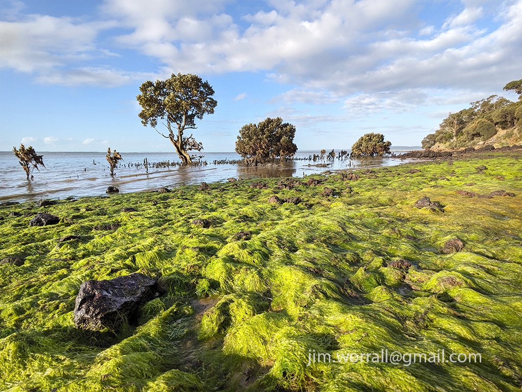 October is a wonderful time on the back beaches of the Mornington Peninsula. The rock platforms are transformed by a thriving carpet of lush greenery that’s only visible near low tide. The photos below were taken at the Bay of Islands, Sorrento, but similar sights can be found all along the Mornington Peninsula back beaches at this time of year.