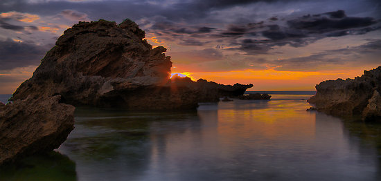 High Tide Sphinx is a slow(ish) exposure taken at high tide as the sun was setting behind the Sphinx rock formation at Sorrento beach, Australia.