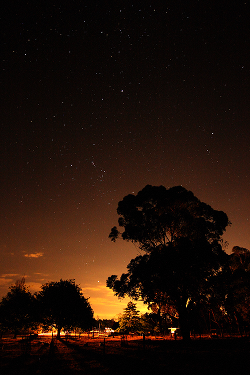 An night time image from semi rural Devon Meadows. The foreground is lit by the long exposure picking up light from a neighbour’s house. Stars are apparent in the night sky.